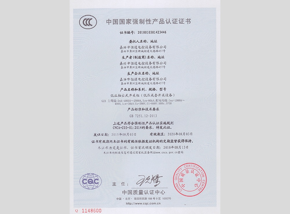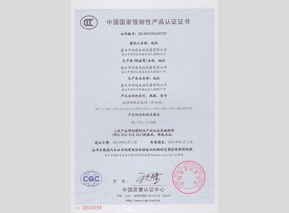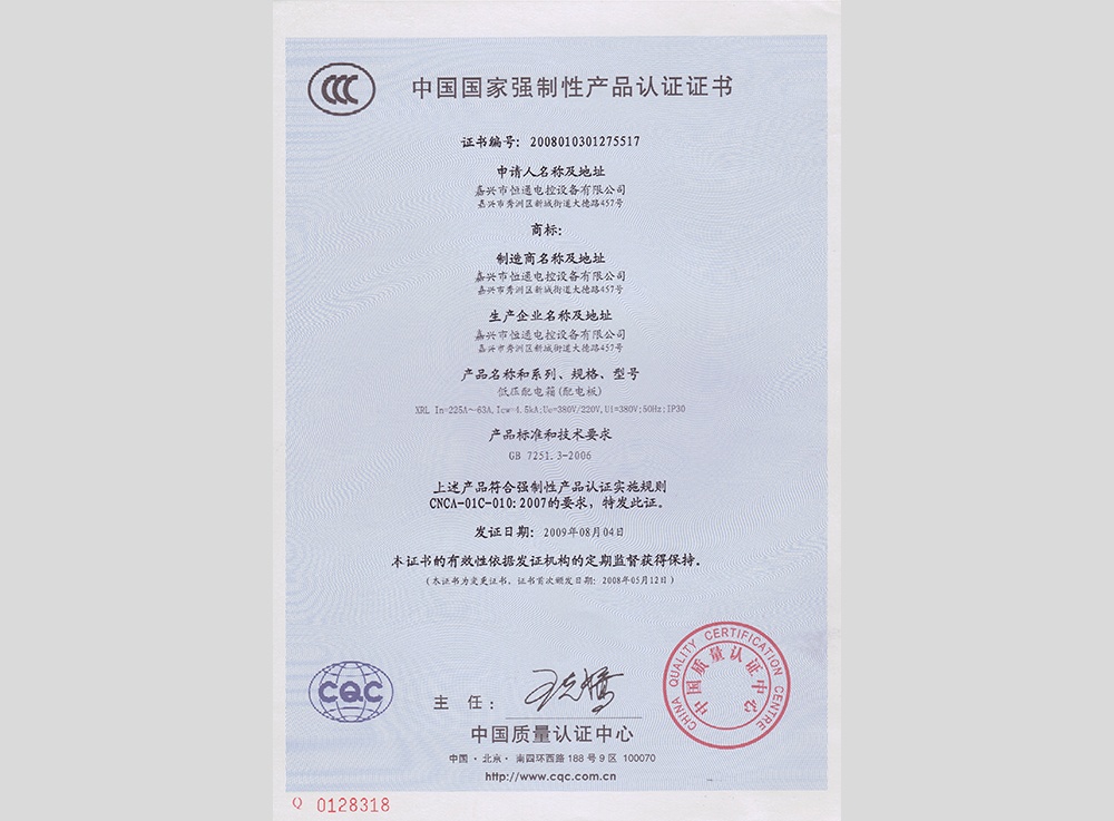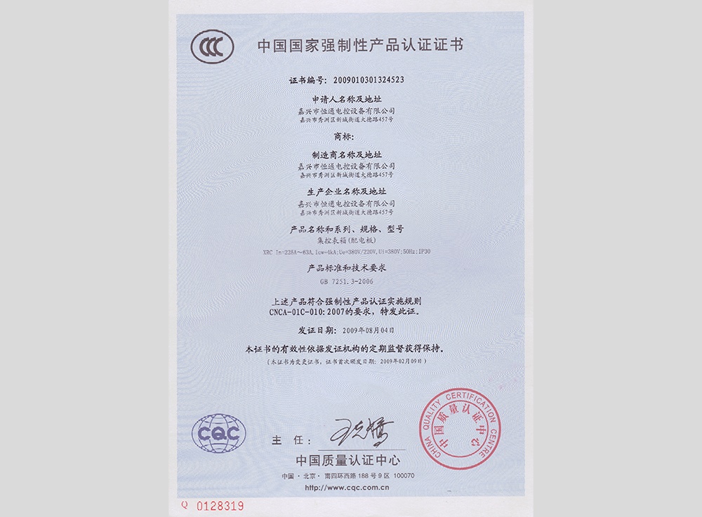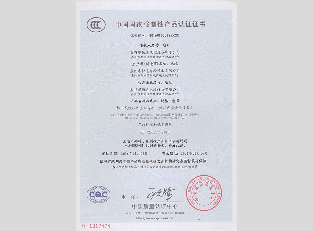 認領"3C"證書及型式試驗報告,產(chǎn)品分別有:高低壓 箱式變電站XBW、高壓中置柜KYN28、抽出式低壓 成套配電柜MNS、低壓抽出式開關柜GCS、低壓配 電柜GGD、電容補償柜GGJ、母線槽CMC、集控表 箱XRC、玻璃鋼集控表箱XRD、低壓動力柜XGL、電 纜分支箱HWF、低壓配電箱XRL、模數(shù)化照明箱PZ30。