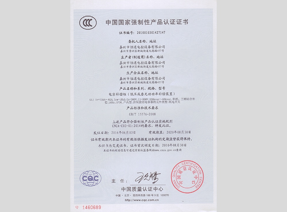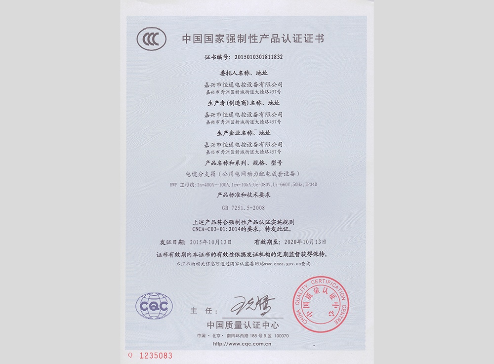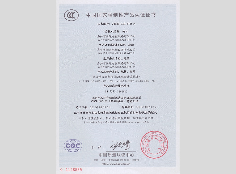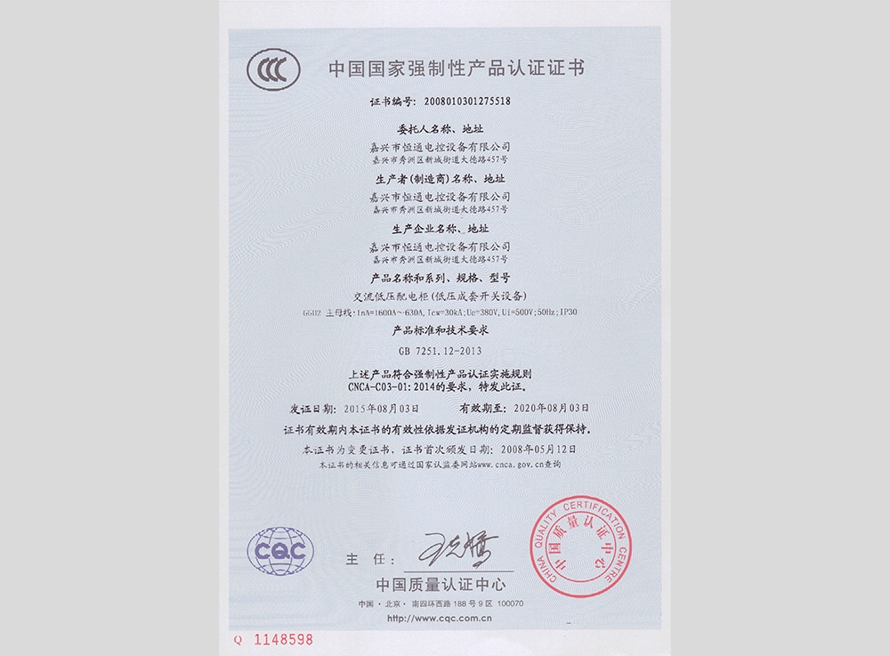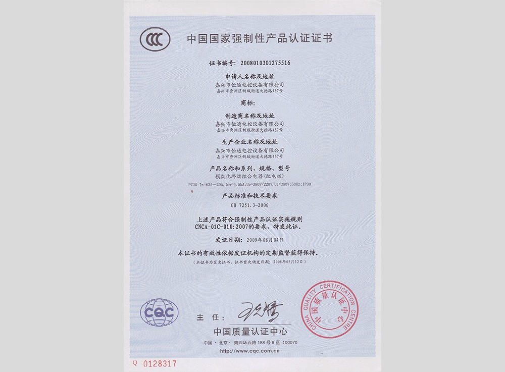 認領"3C"證書及型式試驗報告,產(chǎn)品分別有:高低壓 箱式變電站XBW、高壓中置柜KYN28、抽出式低壓 成套配電柜MNS、低壓抽出式開關柜GCS、低壓配 電柜GGD、電容補償柜GGJ、母線槽CMC、集控表 箱XRC、玻璃鋼集控表箱XRD、低壓動力柜XGL、電 纜分支箱HWF、低壓配電箱XRL、模數(shù)化照明箱PZ30。